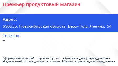 Премьер, продуктовый магазин по адресу 630555, Новосибирская область, Верх-Тула, Ленина, 54 в дальнейшем Организация, размещена в следующих категориях: