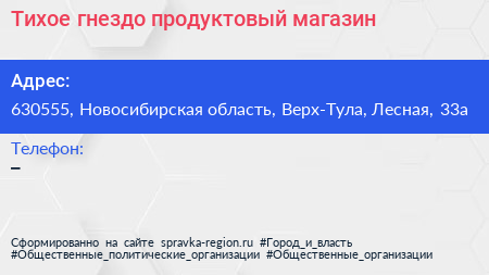 Тихое гнездо, продуктовый магазин по адресу 630555, Новосибирская область, Верх-Тула, Лесная, 33а в дальнейшем Организация, размещена в следующих категориях: