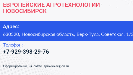 ЕВРОПЕЙСКИЕ АГРОТЕХНОЛОГИИ-НОВОСИБИРСК по адресу 630520, Новосибирская область, Верх-Тула, Советская, 1/3 в дальнейшем Организация, размещена в следующих категориях: