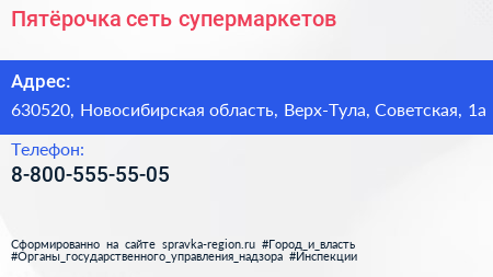 Пятёрочка, сеть супермаркетов по адресу 630520, Новосибирская область, Верх-Тула, Советская, 1а в дальнейшем Организация, размещена в следующих категориях: