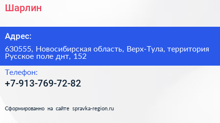 Шарлин по адресу 630555, Новосибирская область, Верх-Тула, территория Русское поле днт, 152 в дальнейшем Организация, размещена в следующих категориях: