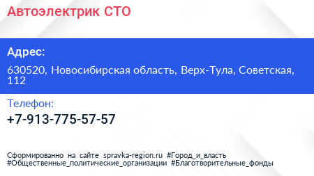 Автоэлектрик, СТО по адресу 630520, Новосибирская область, Верх-Тула, Советская, 112 в дальнейшем Организация, размещена в следующих категориях: