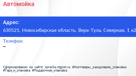 Автомойка по адресу 630521, Новосибирская область, Верх-Тула, Северная, 1 к2 в дальнейшем Организация, размещена в следующих категориях: