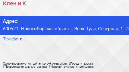 Клен и К по адресу 630521, Новосибирская область, Верх-Тула, Северная, 1 к1 в дальнейшем Организация, размещена в следующих категориях: