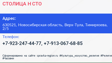 СТОЛИЦА Н, СТО по адресу 630521, Новосибирская область, Верх-Тула, Тимирязева, 2/5 в дальнейшем Организация, размещена в следующих категориях: