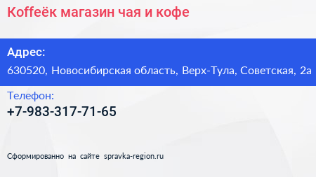 Коffеёк, магазин чая и кофе по адресу 630520, Новосибирская область, Верх-Тула, Советская, 2а в дальнейшем Организация, размещена в следующих категориях: