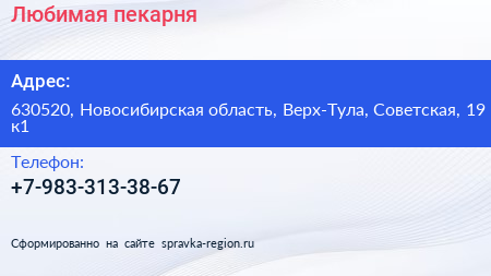 Любимая, пекарня по адресу 630520, Новосибирская область, Верх-Тула, Советская, 19 к1 в дальнейшем Организация, размещена в следующих категориях: