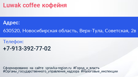 Luwak coffee, кофейня по адресу 630520, Новосибирская область, Верх-Тула, Советская, 2в в дальнейшем Организация, размещена в следующих категориях:
