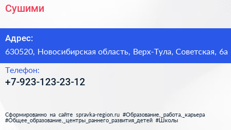 Сушими по адресу 630520, Новосибирская область, Верх-Тула, Советская, 6а в дальнейшем Организация, размещена в следующих категориях: