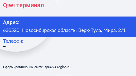 Qiwi, терминал по адресу 630520, Новосибирская область, Верх-Тула, Мира, 2/1 в дальнейшем Организация, размещена в следующих категориях: