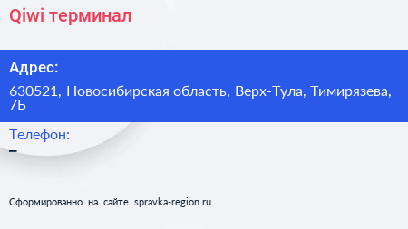 Qiwi, терминал по адресу 630521, Новосибирская область, Верх-Тула, Тимирязева, 7Б в дальнейшем Организация, размещена в следующих категориях: