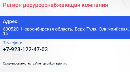 Регион, ресурсоснабжающая компания по адресу 630520, Новосибирская область, Верх-Тула, Олимпийская, 1а в дальнейшем Организация, размещена в следующих категориях: