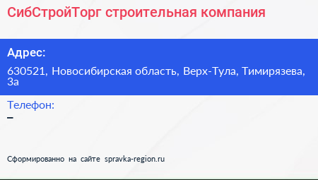 СибСтройТорг, строительная компания по адресу 630521, Новосибирская область, Верх-Тула, Тимирязева, 3а в дальнейшем Организация, размещена в следующих категориях: