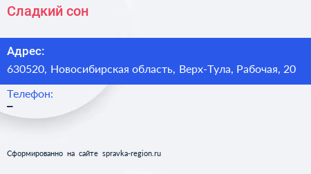 Сладкий сон по адресу 630520, Новосибирская область, Верх-Тула, Рабочая, 20 в дальнейшем Организация, размещена в следующих категориях: