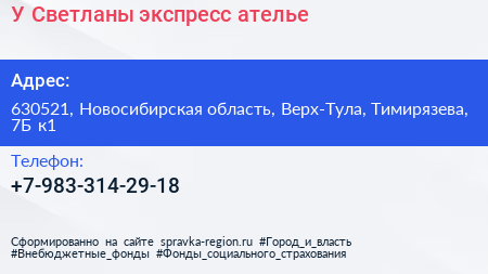 У Светланы, экспресс-ателье по адресу 630521, Новосибирская область, Верх-Тула, Тимирязева, 7Б к1 в дальнейшем Организация, размещена в следующих категориях:
