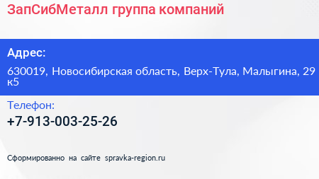 ЗапСибМеталл, группа компаний по адресу 630019, Новосибирская область, Верх-Тула, Малыгина, 29 к5 в дальнейшем Организация, размещена в следующих категориях: