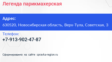 Легенда, парикмахерская по адресу 630520, Новосибирская область, Верх-Тула, Советская, 3 в дальнейшем Организация, размещена в следующих категориях:
