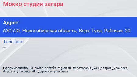 Мокко, студия загара по адресу 630520, Новосибирская область, Верх-Тула, Рабочая, 20 в дальнейшем Организация, размещена в следующих категориях: