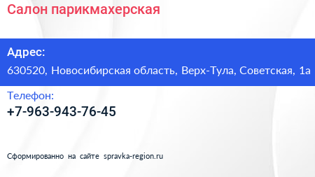Салон-парикмахерская по адресу 630520, Новосибирская область, Верх-Тула, Советская, 1а в дальнейшем Организация, размещена в следующих категориях: