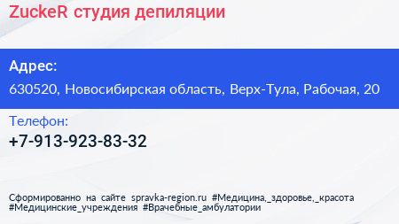 ZuckeR, студия депиляции по адресу 630520, Новосибирская область, Верх-Тула, Рабочая, 20 в дальнейшем Организация, размещена в следующих категориях: