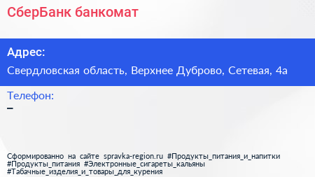 СберБанк, банкомат по адресу Свердловская область, Верхнее Дуброво, Сетевая, 4а в дальнейшем Организация, размещена в следующих категориях: