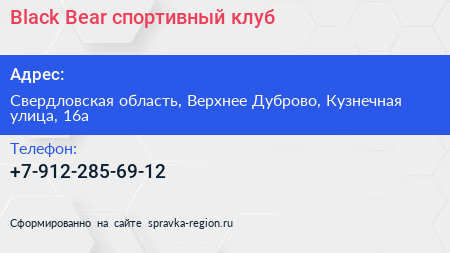 Black Bear, спортивный клуб по адресу Свердловская область, Верхнее Дуброво, Кузнечная улица, 16а в дальнейшем Организация, размещена в следующих категориях:
