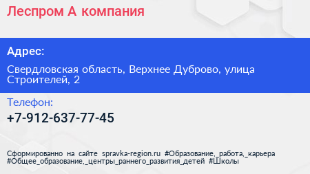 Леспром А, компания по адресу Свердловская область, Верхнее Дуброво, улица Строителей, 2 в дальнейшем Организация, размещена в следующих категориях: