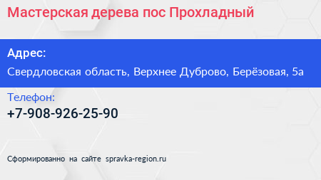 Мастерская дерева, пос. Прохладный по адресу Свердловская область, Верхнее Дуброво, Берёзовая, 5а в дальнейшем Организация, размещена в следующих категориях:
