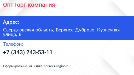 ОптТорг, компания по адресу Свердловская область, Верхнее Дуброво, Кузнечная улица, 8 в дальнейшем Организация, размещена в следующих категориях: