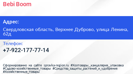 Bebi.Boom по адресу Свердловская область, Верхнее Дуброво, улица Ленина, 62д в дальнейшем Организация, размещена в следующих категориях: