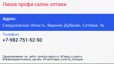 Линза-профи, салон оптики по адресу Свердловская область, Верхнее Дуброво, Сетевая, 4а в дальнейшем Организация, размещена в следующих категориях: