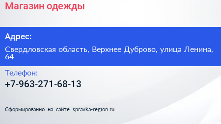 Магазин одежды по адресу Свердловская область, Верхнее Дуброво, улица Ленина, 64 в дальнейшем Организация, размещена в следующих категориях: