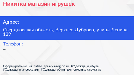 Никитка, магазин игрушек по адресу Свердловская область, Верхнее Дуброво, улица Ленина, 129 в дальнейшем Организация, размещена в следующих категориях: