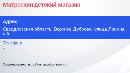 Матроскин, детский магазин по адресу Свердловская область, Верхнее Дуброво, улица Ленина, 62г в дальнейшем Организация, размещена в следующих категориях: