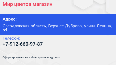 Мир цветов, магазин по адресу Свердловская область, Верхнее Дуброво, улица Ленина, 64 в дальнейшем Организация, размещена в следующих категориях: