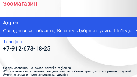 Зоомагазин по адресу Свердловская область, Верхнее Дуброво, улица Победы, 7 в дальнейшем Организация, размещена в следующих категориях: