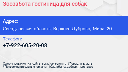 Зоозабота, гостиница для собак по адресу Свердловская область, Верхнее Дуброво, Мира, 20 в дальнейшем Организация, размещена в следующих категориях: