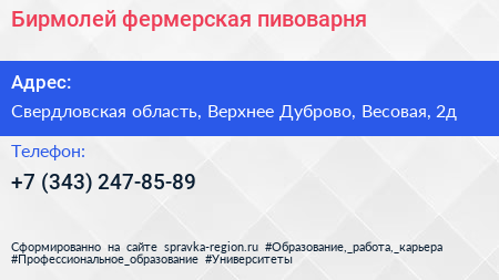 Бирмолей, фермерская пивоварня по адресу Свердловская область, Верхнее Дуброво, Весовая, 2д в дальнейшем Организация, размещена в следующих категориях: