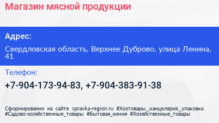 Магазин мясной продукции по адресу Свердловская область, Верхнее Дуброво, улица Ленина, 41 в дальнейшем Организация, размещена в следующих категориях: