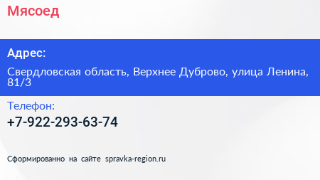 Мясоед по адресу Свердловская область, Верхнее Дуброво, улица Ленина, 81/3 в дальнейшем Организация, размещена в следующих категориях: