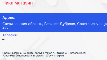 Ника, магазин по адресу Свердловская область, Верхнее Дуброво, Советская улица, 29а в дальнейшем Организация, размещена в следующих категориях: