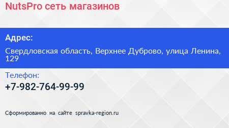 NutsPro, сеть магазинов по адресу Свердловская область, Верхнее Дуброво, улица Ленина, 129 в дальнейшем Организация, размещена в следующих категориях: