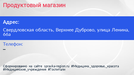 Продуктовый магазин по адресу Свердловская область, Верхнее Дуброво, улица Ленина, 66а в дальнейшем Организация, размещена в следующих категориях: