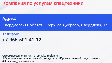 Компания по услугам спецтехники по адресу Свердловская область, Верхнее Дуброво, Свердлова, 1е в дальнейшем Организация, размещена в следующих категориях: