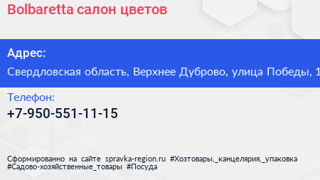 Bolbaretta, салон цветов по адресу Свердловская область, Верхнее Дуброво, улица Победы, 1 в дальнейшем Организация, размещена в следующих категориях: