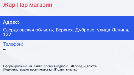 Жар Пар, магазин по адресу Свердловская область, Верхнее Дуброво, улица Ленина, 129 в дальнейшем Организация, размещена в следующих категориях: