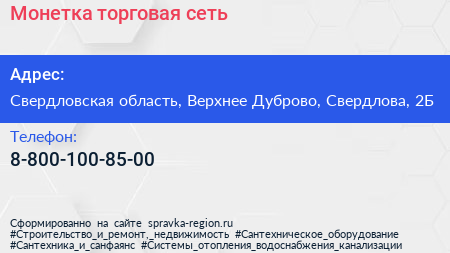 Монетка, торговая сеть по адресу Свердловская область, Верхнее Дуброво, Свердлова, 2Б в дальнейшем Организация, размещена в следующих категориях: