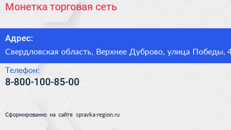 Монетка, торговая сеть по адресу Свердловская область, Верхнее Дуброво, улица Победы, 4 в дальнейшем Организация, размещена в следующих категориях: