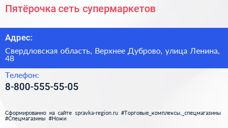 Пятёрочка, сеть супермаркетов по адресу Свердловская область, Верхнее Дуброво, улица Ленина, 48 в дальнейшем Организация, размещена в следующих категориях:
