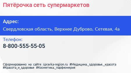 Пятёрочка, сеть супермаркетов по адресу Свердловская область, Верхнее Дуброво, Сетевая, 4а в дальнейшем Организация, размещена в следующих категориях: